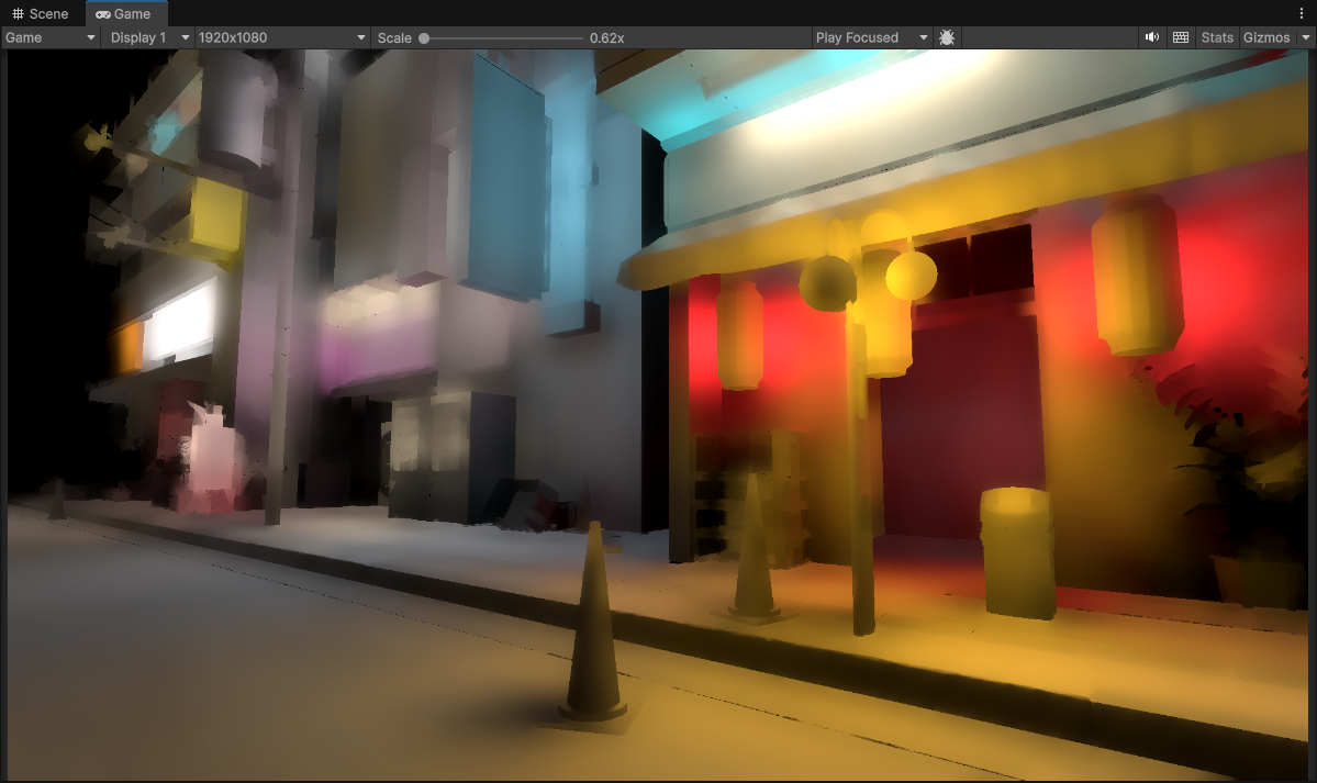 If your effects don’t need to utilize scene depth/normal or any other related buffers this might be fine. But for my case where I’m calculating a lighting buffer that large parts of my project will be lit by… this is not good at all. We can’t use this as is, so we need to do some work in order to make this low resolution image usable.
